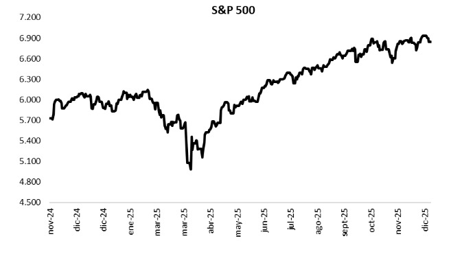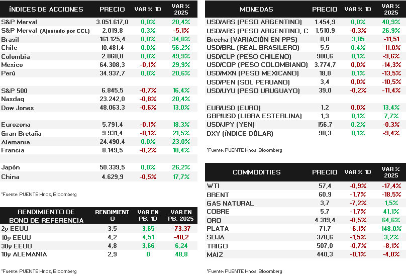 El miércoles, los principales índices de acciones estadounidenses retrocedieron en forma generalizada, durante la última rueda de negociación del año 2025. De esta manera, el S&P 500 cayó -0,7%, el Nasdaq -0,8% y el Dow Jones -0,6%, y cerraron el año con variaciones acumuladas de +16,4%, +20,4% y +13%, respectivamente.